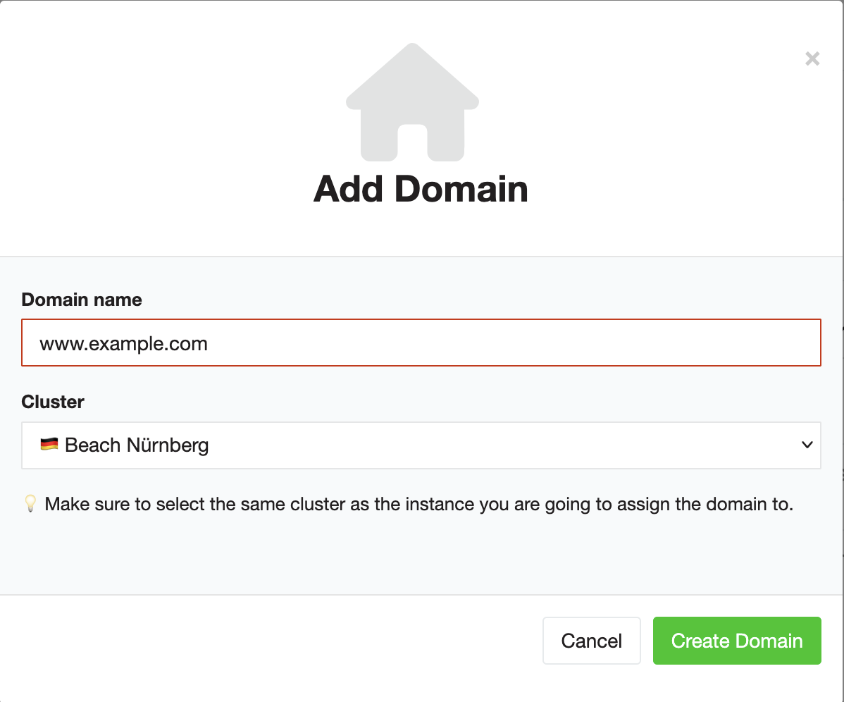 Log in to the Beach user interface and navigate to the "Domains" section of your organisation. Then click on the "Add many domains" button. In the following dialogue, you can then add one domain per line. And with a little trick, you can even set up redirects and instance assignments right away.