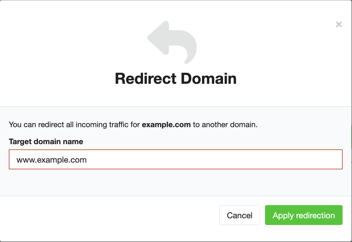 Click the pencil icon next to the example.com domain. On the following page click the Redirect… button and enter www.example.com in the following dialog as the domain Beach should redirect to.