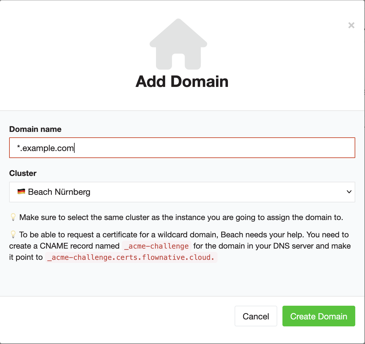 Beach can also handle wildcard domains. You can create these by using an asterisk in the domain name, e.g. *.example.com. The rest of the process for assigning a domain to an instance remains the same.