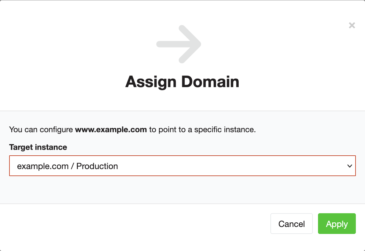 Navigate back to the domain overview in the Beach user interface. Click the pencil icon next to www.example.com and on the following page click the Assign… button. Choose your primary domain for the instance (in our case www.example.com).