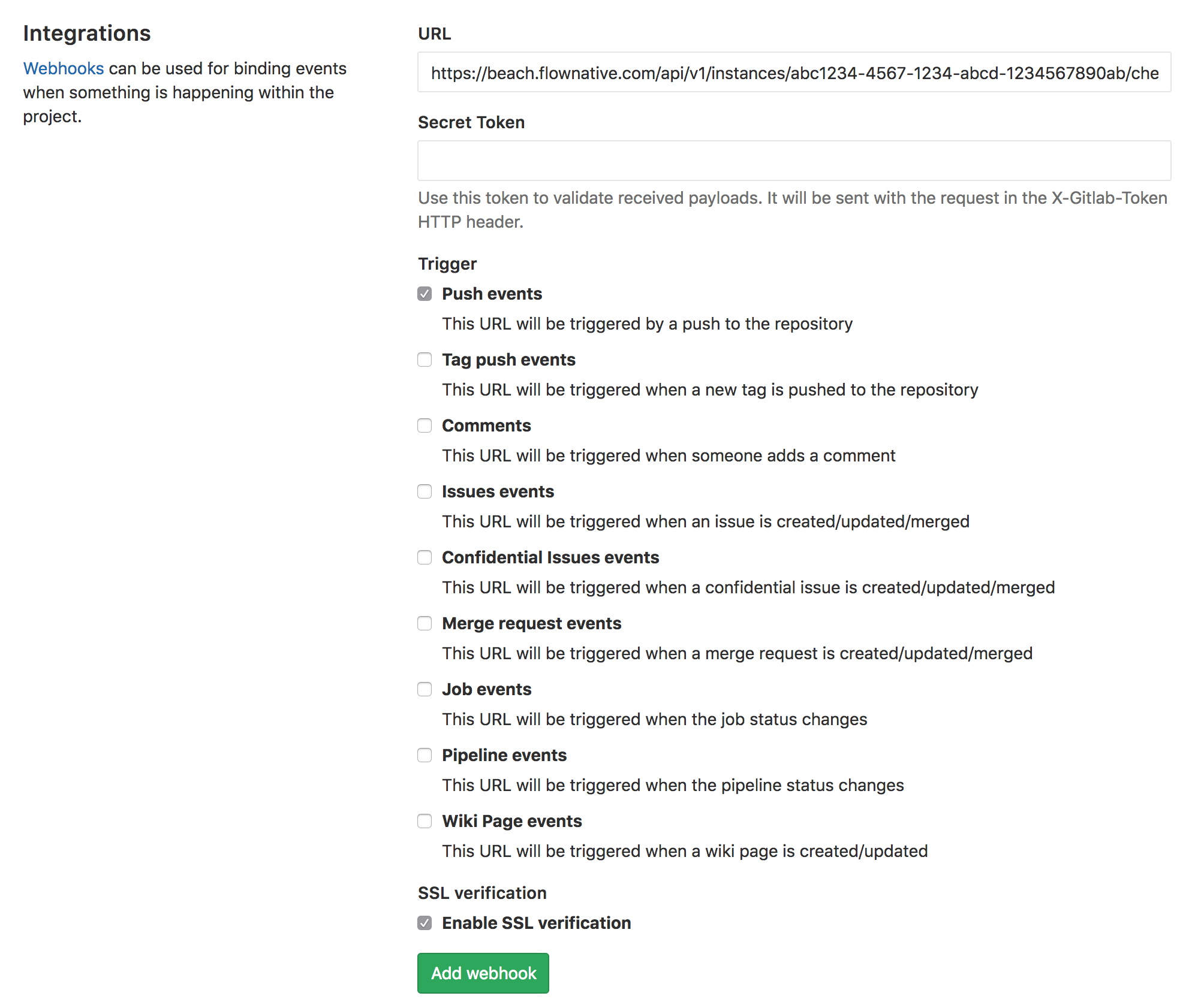 In GitLab navigate to the Settings > Integrations menu of the Git repository used in your Beach instance. You will set up a new webhook which will trigger the build in Beach.