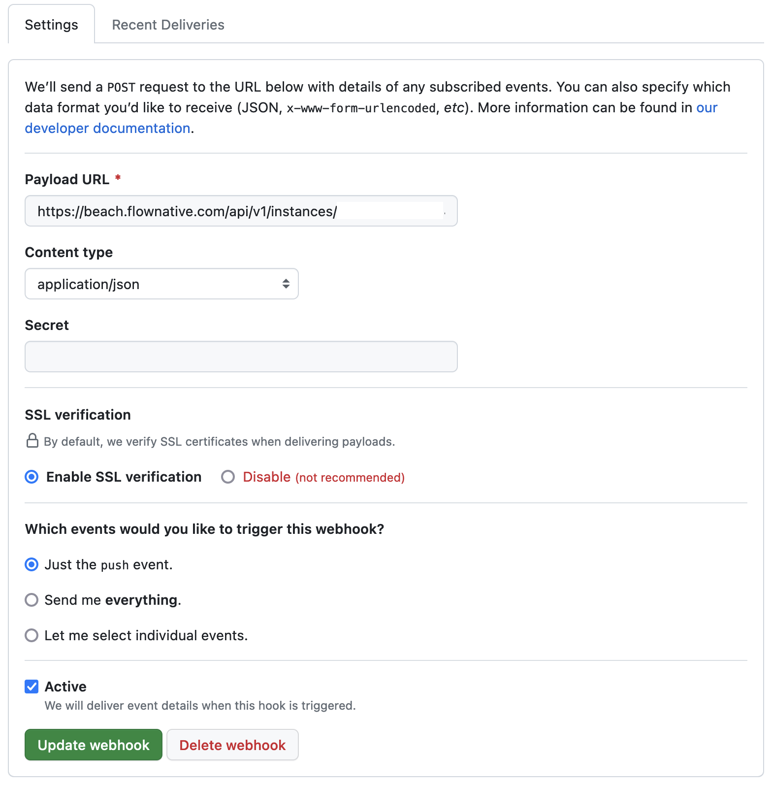 Enter the full URL of the webhook as given in your Beach instance settings, including the instance identifier and the access token.